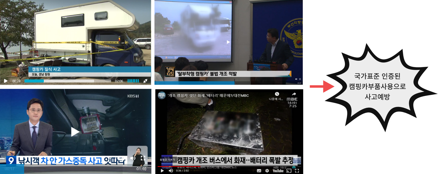 인증받지 않은 제품으로 캠핑카를 만들거나 사용하면 아래와 같은 사고가 발생합니다.