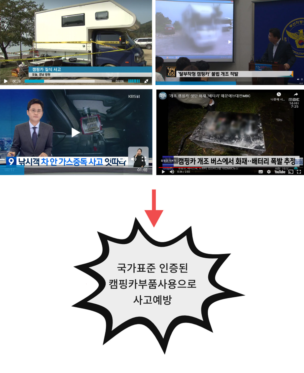 인증받지 않은 제품으로 캠핑카를 만들거나 사용하면 아래와 같은 사고가 발생합니다.